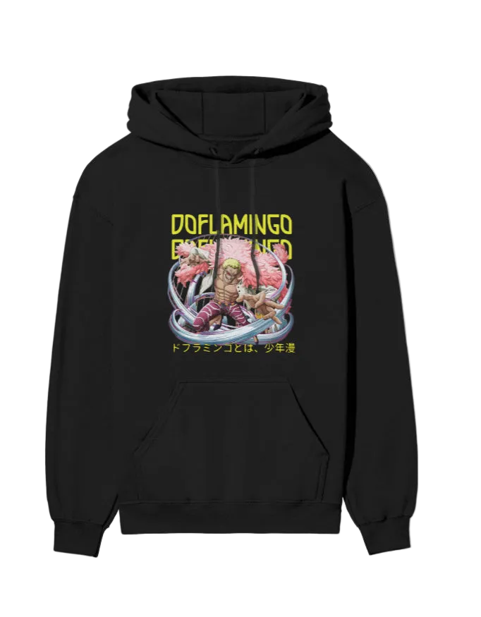 Doflamingo One Piece Hoodie cultural artwork with everyday comfort. Crafted from 100% cotton, 300 GSM brushed fleece, this hoodie feels warm, soft, and cozy—perfect for chilly days, casual outings, or winter layering. The unisex regular fit provides a balanced silhouette—snug around the cuffs and hem while maintaining a comfortable, relaxed feel throughout the body. The Banjara-inspired artwork adds a signature touch, giving your outfit a stylish cultural edge.