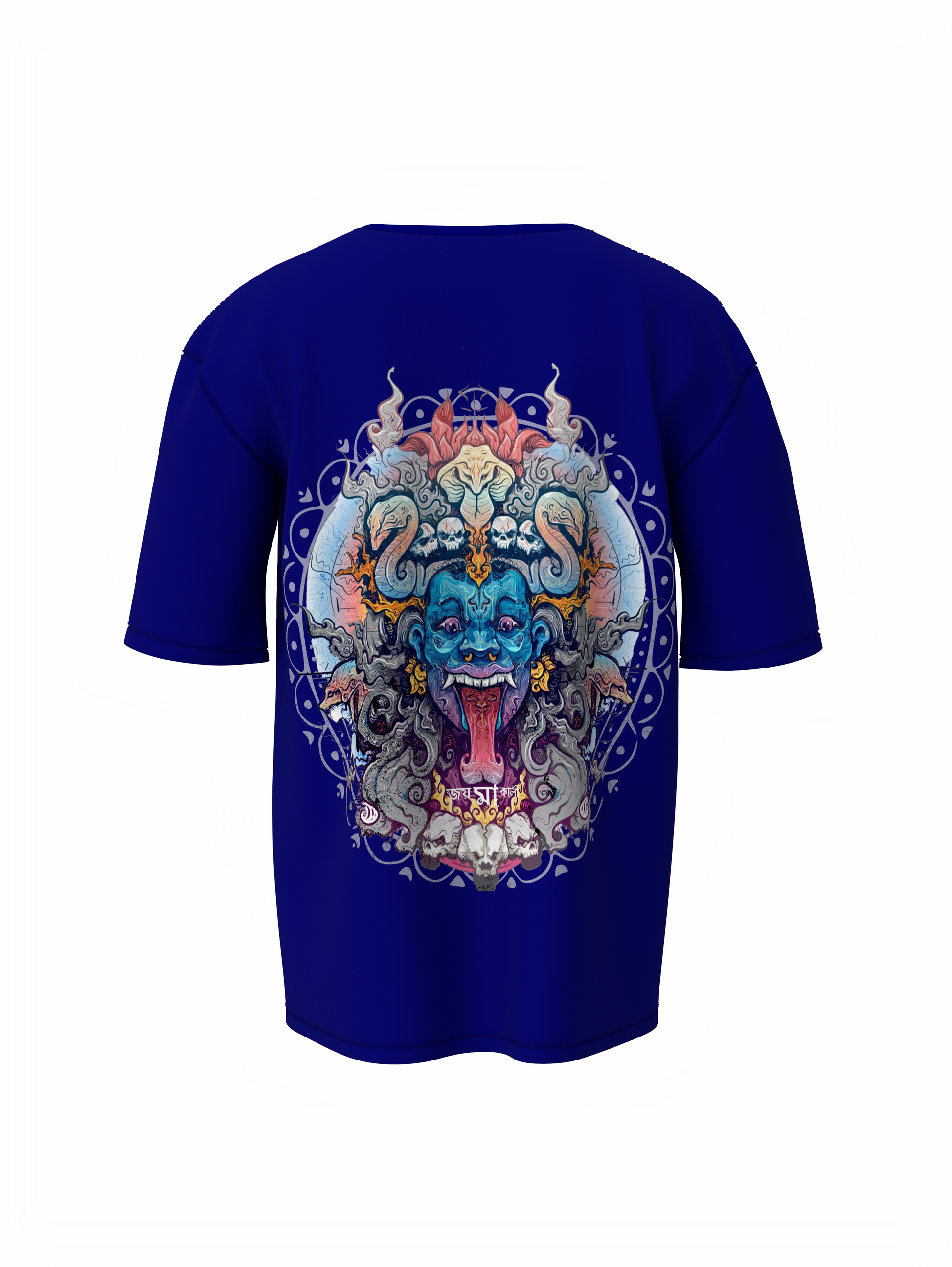 - Pattern: Unique, high-impact front and back print showcasing Ma Kali's fierce expression, symbolic weapons, and divine elements like flames, skull garlands, and third-eye energy.